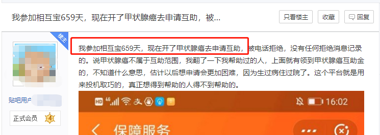 在相互宝贴吧中,有一位网友发帖控诉:参加了相互宝659天,现在患有甲状腺癌却被拒绝。