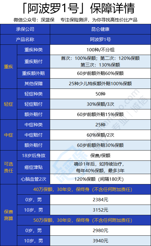 阿波罗1号重疾险是昆仑健康推出的一款高性价比产品。