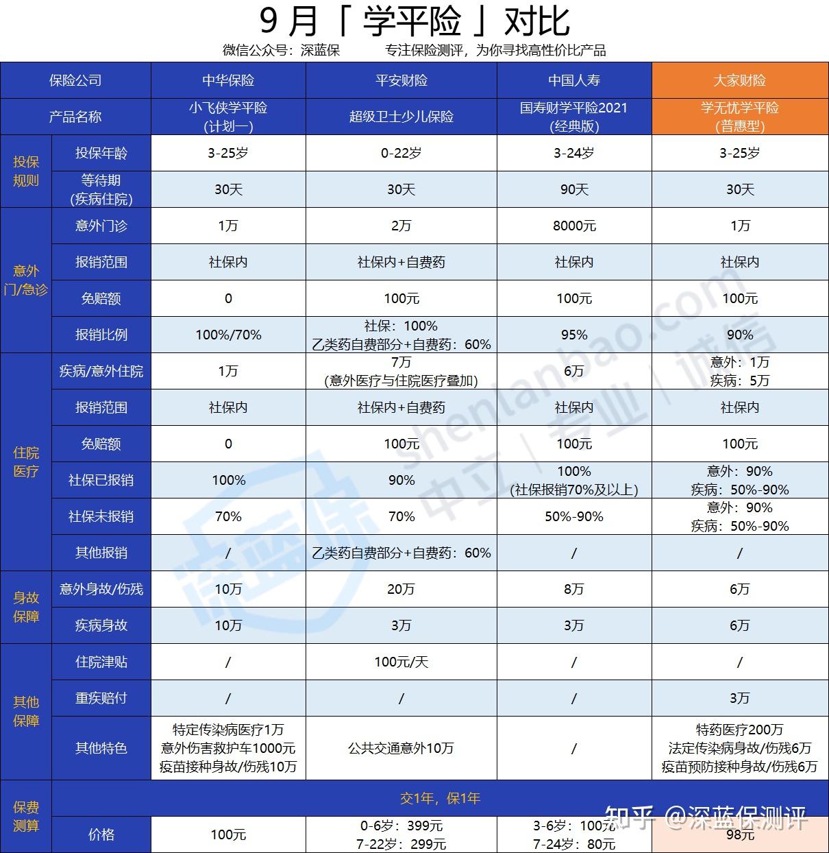 与其他几款学平险相比,大家学无忧学平险(普惠型)保障还算全面,多了一项重疾责任,但住院医疗报销力度小,拉低了性价比,整体性价比不如同等价位的小飞侠学平险(计划一)。