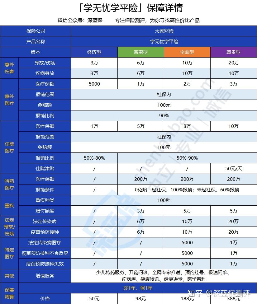 大家学无忧学平险是一款涵盖了意外险+小额医疗险+重疾险的全面型保险产品,责任非常丰富,不仅保障了基础的意外医疗、住院医疗、意外身故/伤残,而且保障了法定传染病和疫苗预防接种。