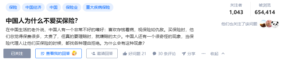 知乎上有这样一个高流量问题:“中国人为什么不爱买保险?”