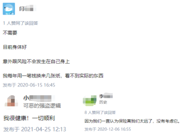 除了一部分朋友觉得保险理赔难以外,也有不少人觉得保险的作用离自己非常遥远,我们再来看看这些朋友是怎么说的。
