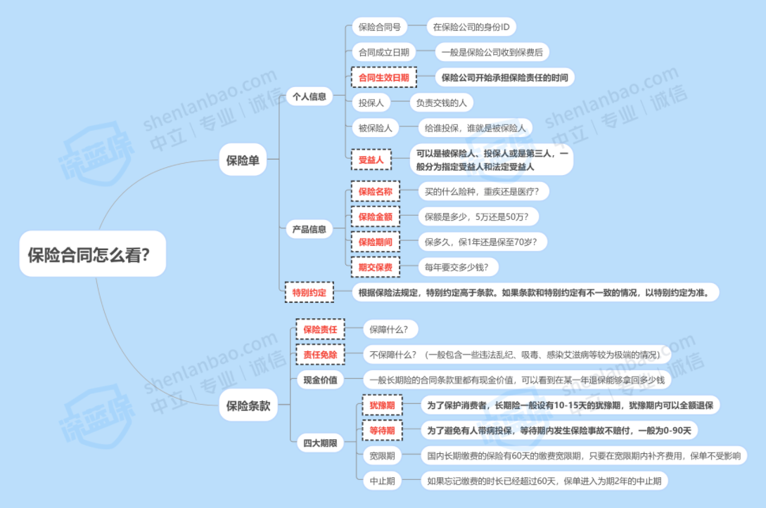 保险单中一般包括了个人信息、产品信息和特别约定,除了常规的产品信息需要关注以外,也需要注意个人信息中的合同生效日期和特别约定;