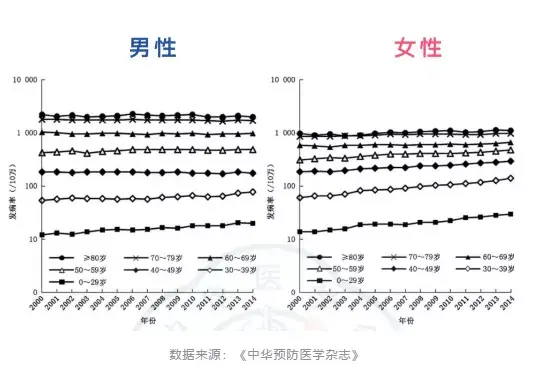 - 年轻人的发病率在升高:无论男女,40 岁以下的发病率在逐渐升高。