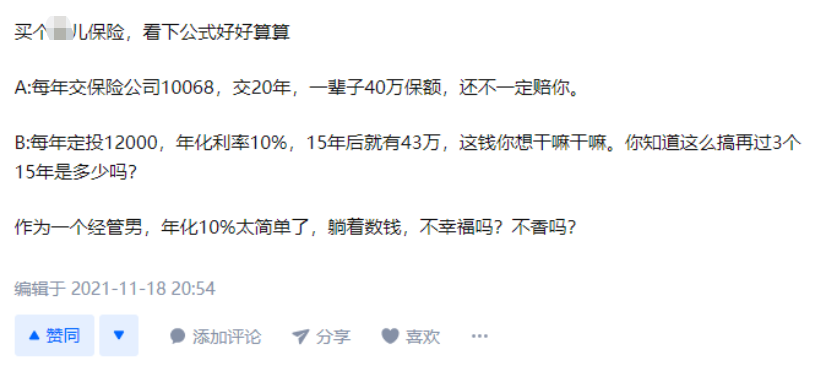 这位经管男的分析看似有条有理,但大师兄还是不得不说几句,毕竟作为一个保险科普答主有义务让大家了解保险的真相。