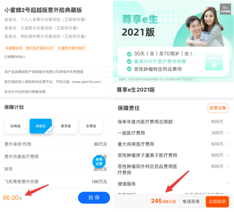可以看到,不仅夫妻二人都能够得到保额高达好几百万元的、能够有效应对各类风险的全面保障,人均价格也才不到4000元。