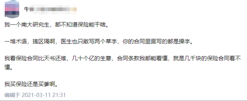 保险条款短则十几页,长则几十页,密密麻麻的文字拆开来都认识,凑在一起就让不少人都摸不着头脑,比如下面这位牛兄: