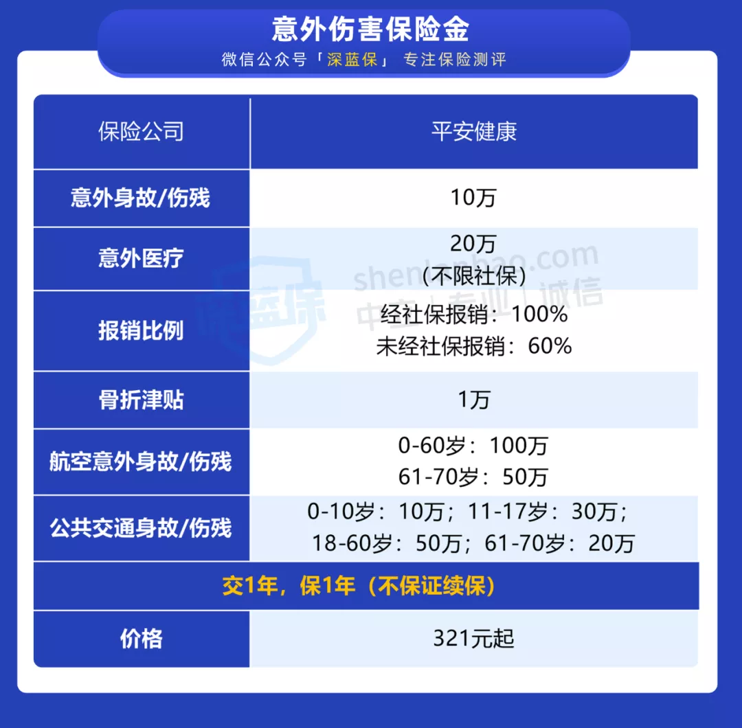 对于不同年龄,意外险价格不一样,大概每年在 300 - 400 元,交一年保一年。