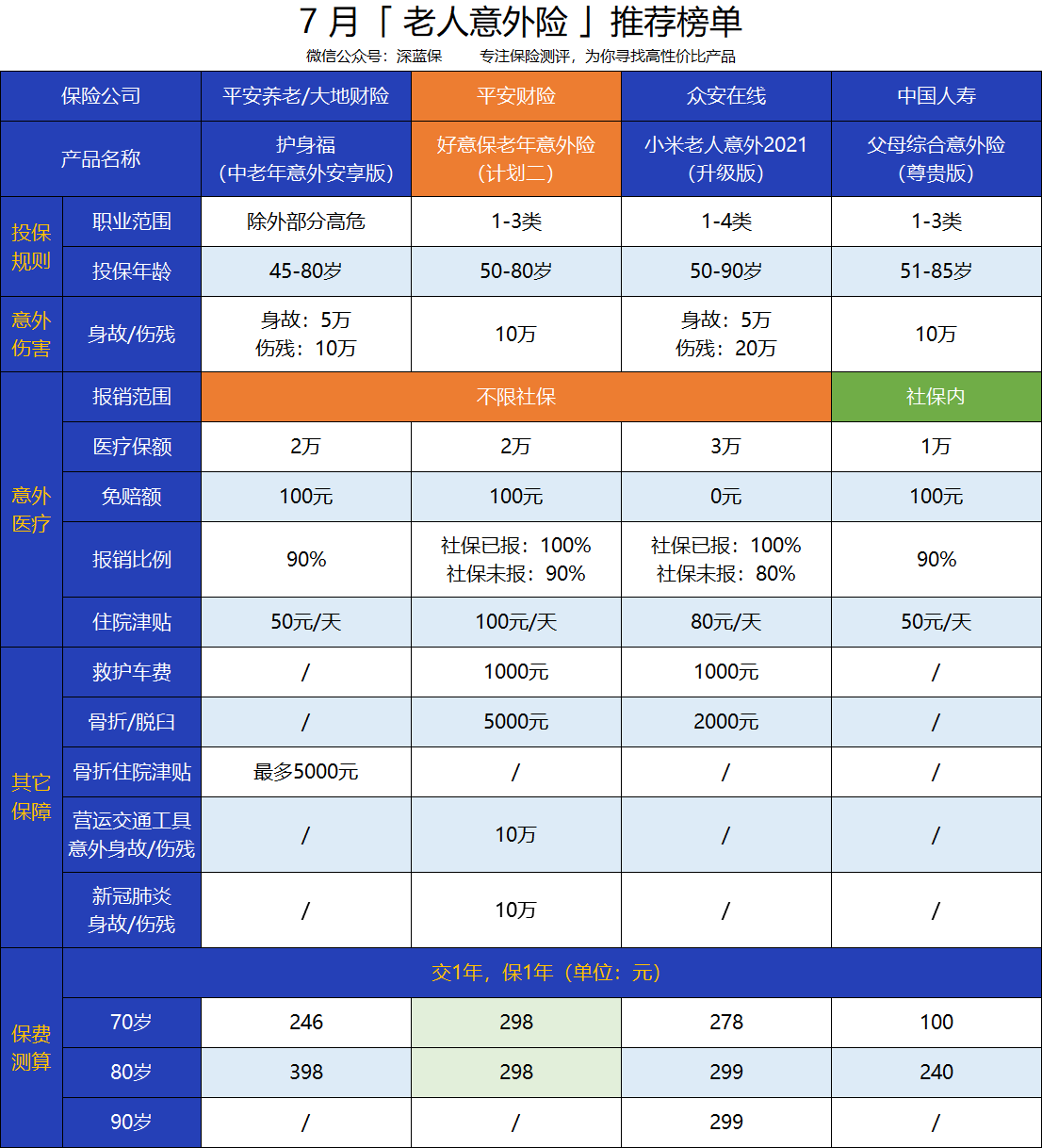- 如果追求大品牌:考虑选择平安好意保老年意外险,保障很全面,意外医疗的报销条件很不错,还有骨折保险金,价钱不贵,性价比可以。
