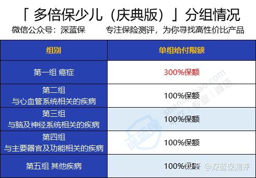 一共5组,癌症(重度)单独分组,并能赔300%保额,相当于可以理赔3次;剩下的疾病被分为4组,每组赔100%保额,相当于可以理赔4次。