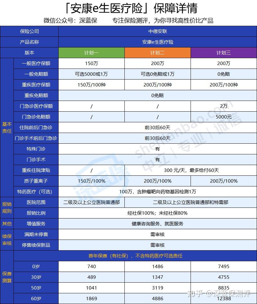 对比来看,中德安联安康e生医疗险的整体表现还可以,保障较全面,住院前后门急诊时间范围更广,免赔额灵活可选,计划二还支持在“特需部”治疗,选择计划二的价格不算贵,性价比还可以。