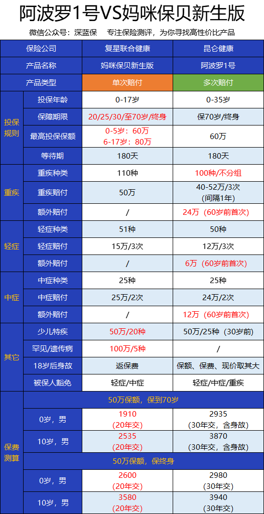 - 阿波罗1号重疾险VS妈咪保贝新生版,怎么选?