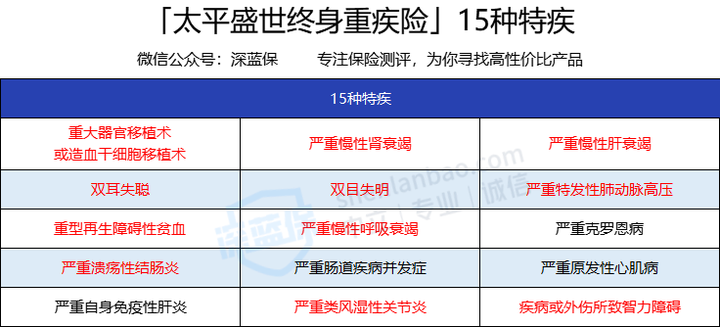 太平盛世终身重疾险保障15种特疾,在65岁前首次确诊,可以额外获赔100%的基本保额。