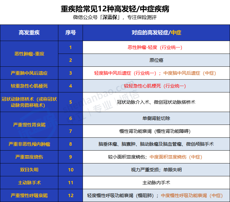 鉴别一款重疾险轻中症责任的好坏,不能单看疾病数量,还要确认12种高发疾病是否全面。