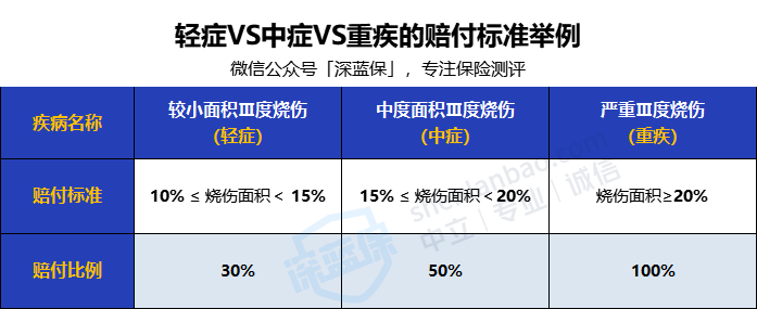 比如Ⅲ度烧伤,根据重疾险赔付标准的通常分成了轻、中、重疾三种,