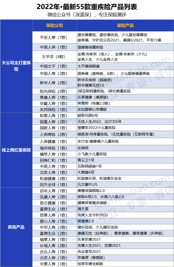 比如这期,我测评了以下55款重疾险: