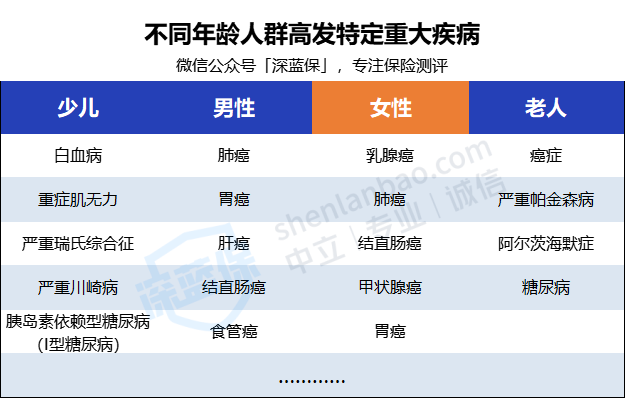 根据人群,我们一般分成三种:少儿、成人男/女性、高龄特定重大疾病。