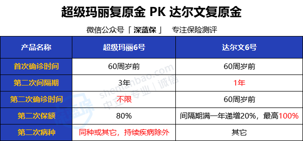先说中症:超级玛丽6号在60岁前患中症可以额外赔付20%,而达尔文6号并没有。