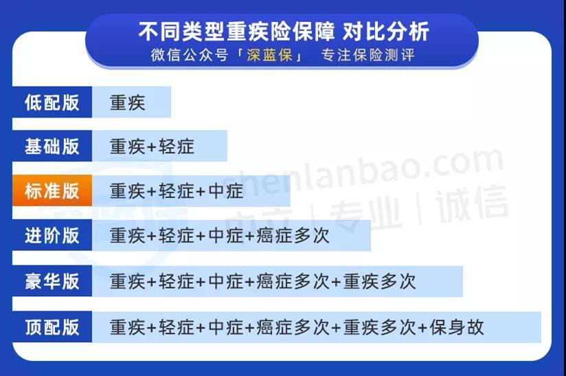 而适用于我们大多人的都是标准版:【重疾+轻症+中症】,保障基本全面,控制预算的同时还能买到更高的保额。