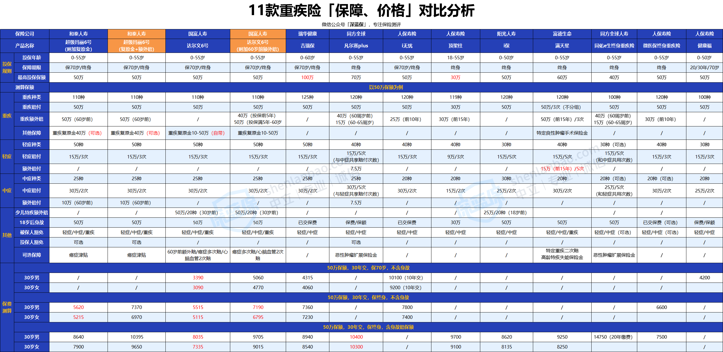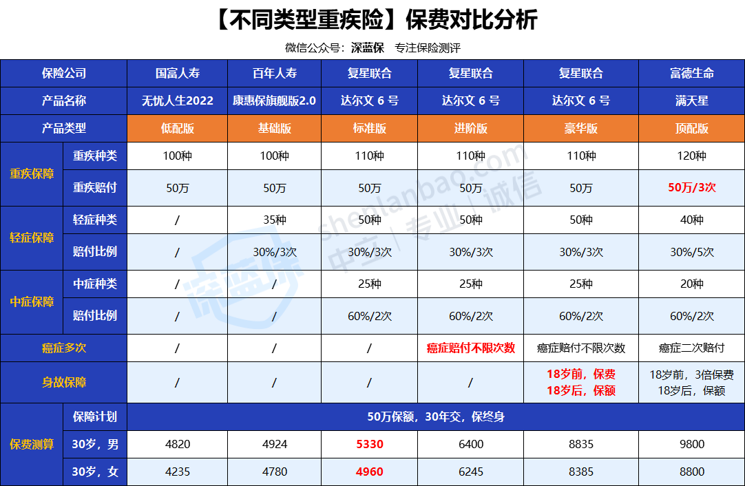 我找了几款大公司主打重疾险和两款线上网红重疾险,来做对比;