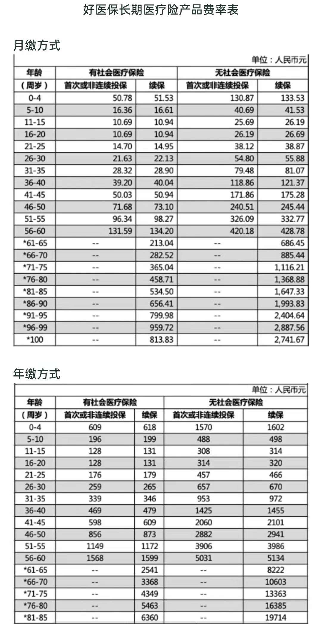 我以销量超过 3000 万份的好医保为例,贴出它各个年龄段的费率表,有医保和没医保产生的保费,相差悬殊: