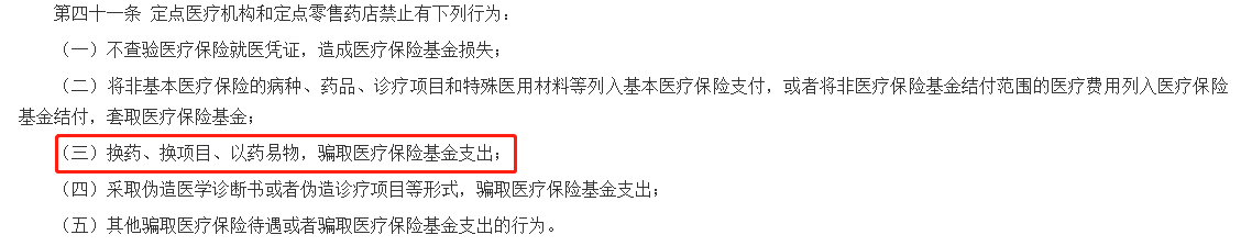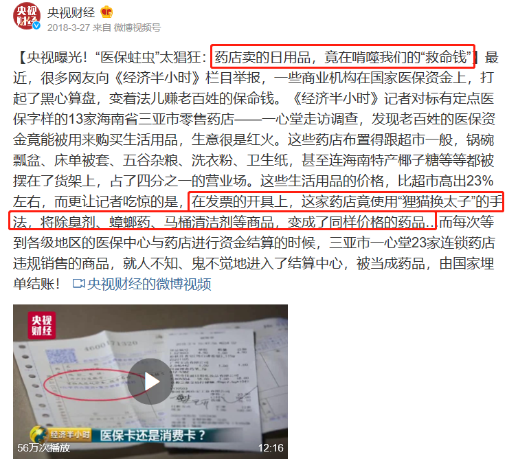之前有新闻报道,某些医保定点药房,打出“可以用医保卡刷店里的生活用品、食品”的招牌招揽顾客,开发票时用相近价格的药品代替,从而实现用医保卡结算生活用品、食品的目的。