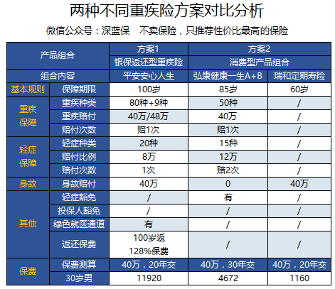 我们做了2种重疾对比方案,四种银行销售的重疾险中,拿平安人寿安心人生来对比。大家可以看下选择不同方案时,保障和保费的差异。